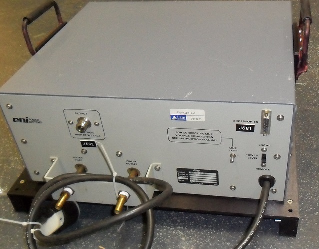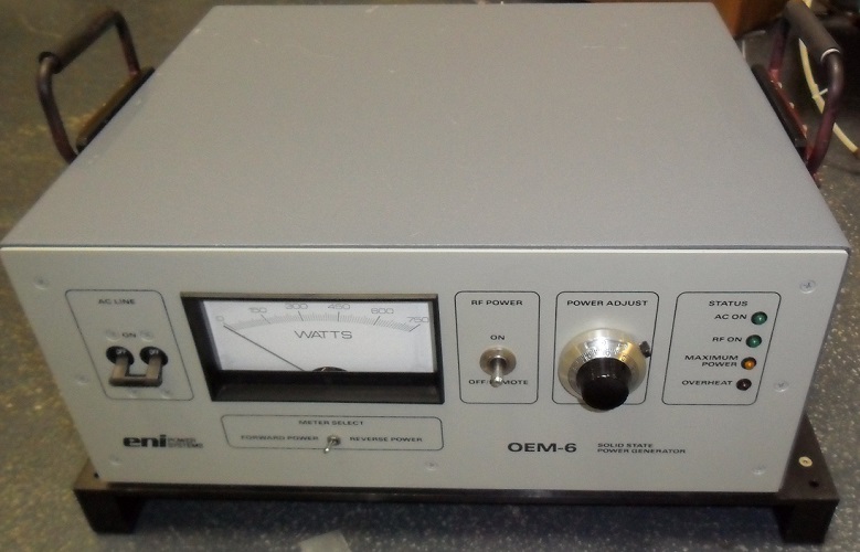 The AutoEtch is equipped with ENI RF Power Supplies; solid state, water cooled, 650 Watt or 1.25 Kilowatt generators which are mounted on slides directly above the controller drawer. These generators operate at 13.56 megahertz with an output Impedance of 50 ohms. The RF output power is connected to an RF match box where the chamber impedance is matched to the generator output impedance to provide maximum RF power transfer. The generators are automatically controlled by the AutoEtch system.